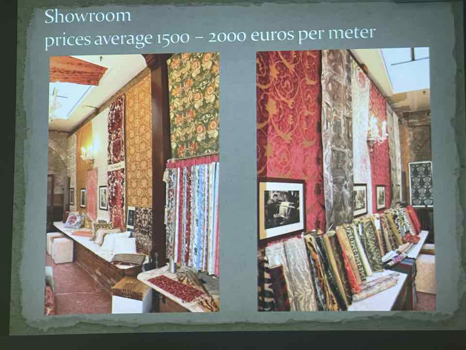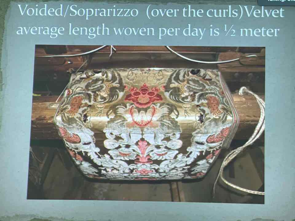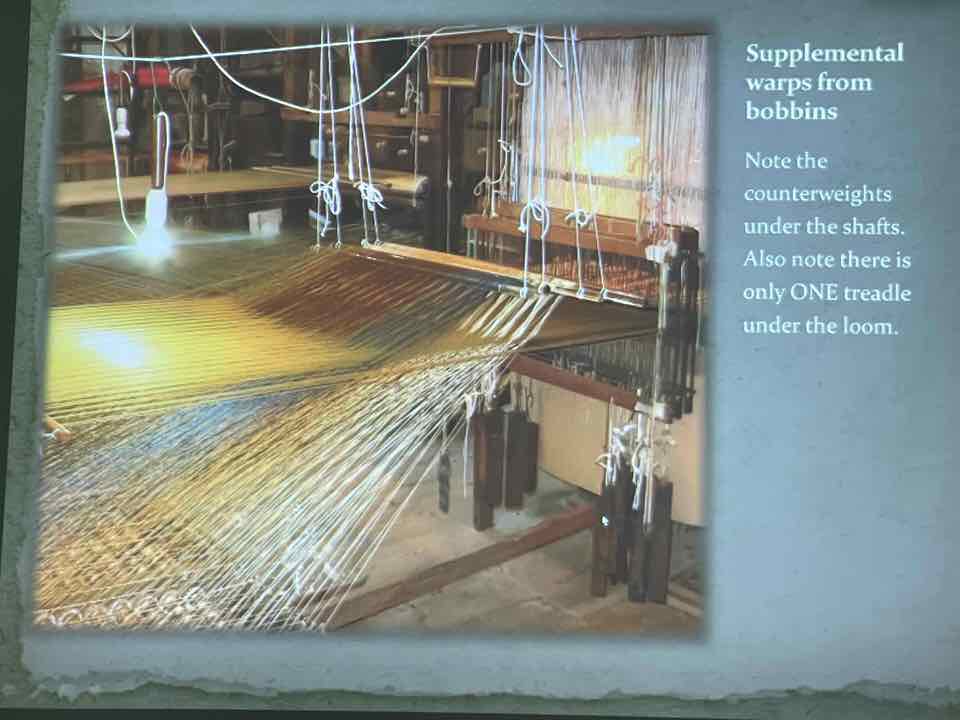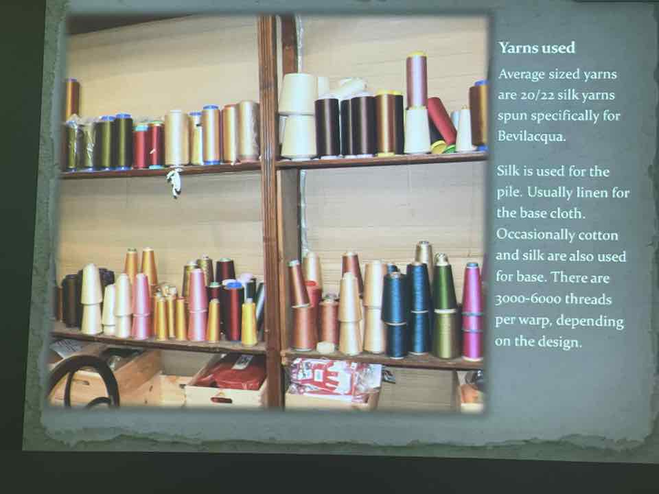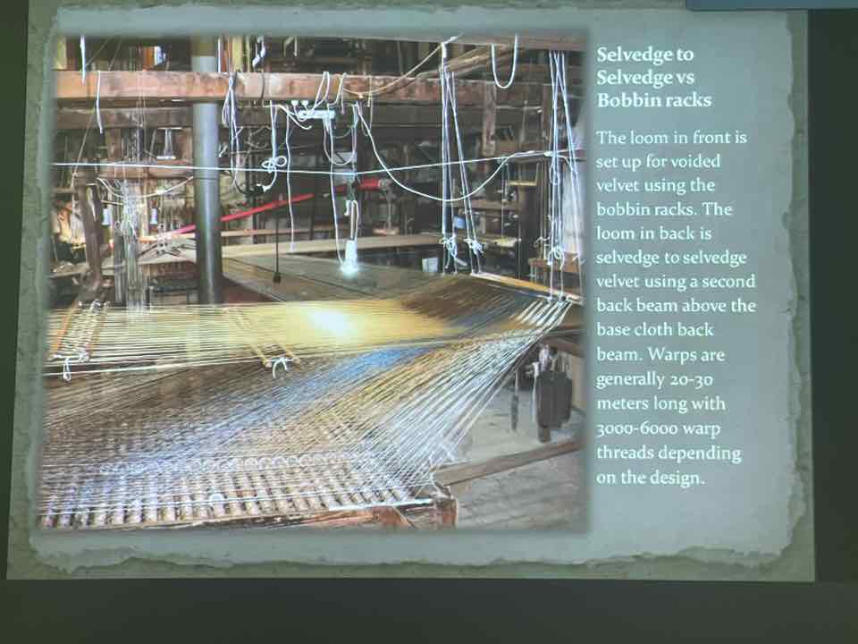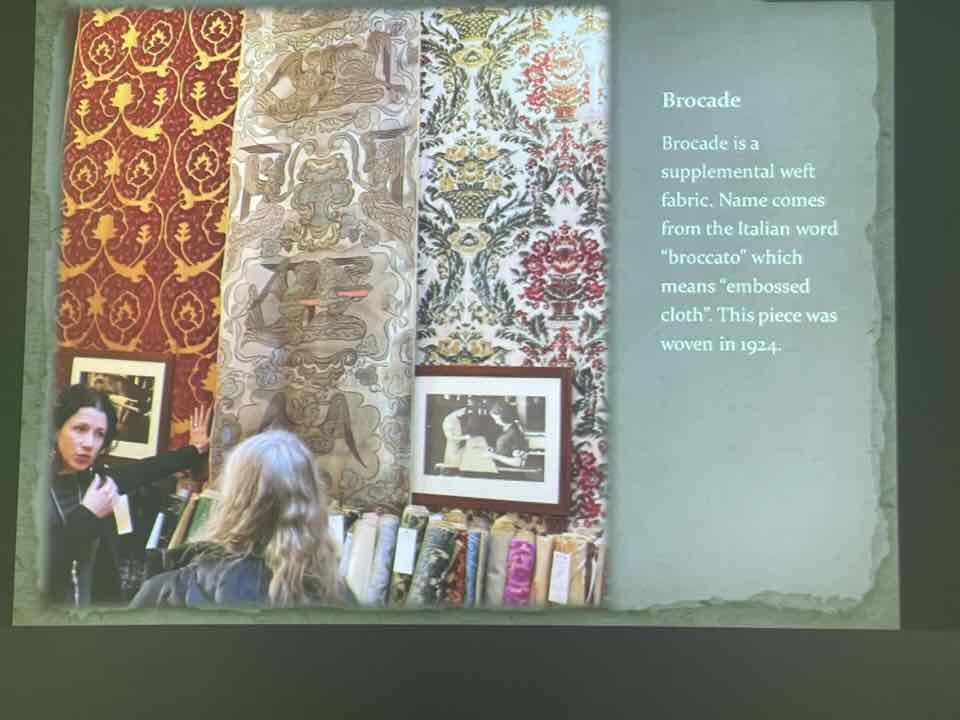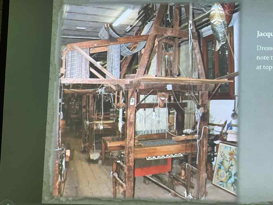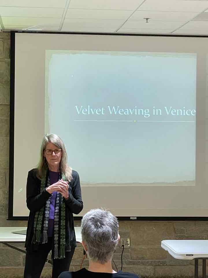 Deb Essen regaled us with stories from her Tour in Venice at the velvet-weaving atelier of Luigi Bevilacqua on the Grand Canal in Venice. The workshop has been in existence since medieval times and much of the equipment dates back centuries. The looms are mechanical dobby looms that use centuries-old and modern cards control the weaving patterns. The photographs in Deb’s slide show were taken by Marty Essen.