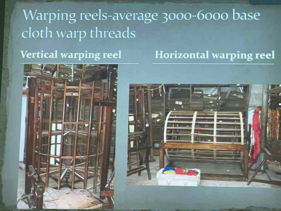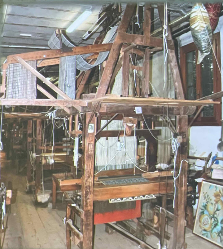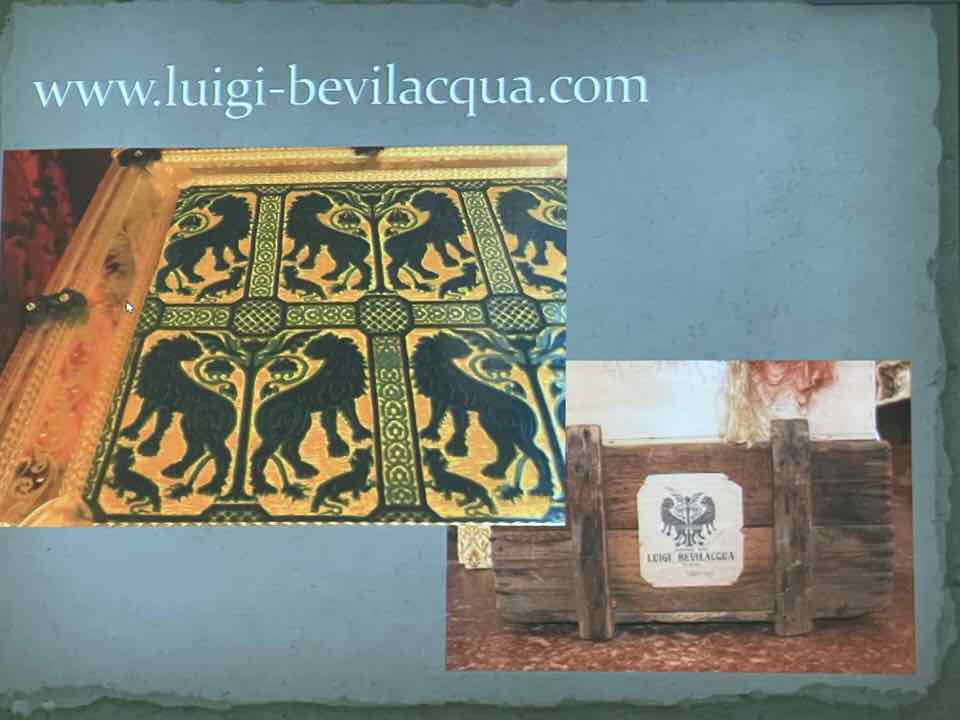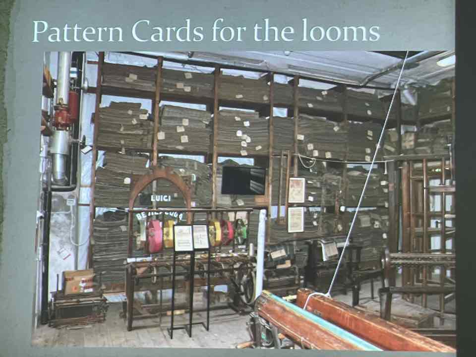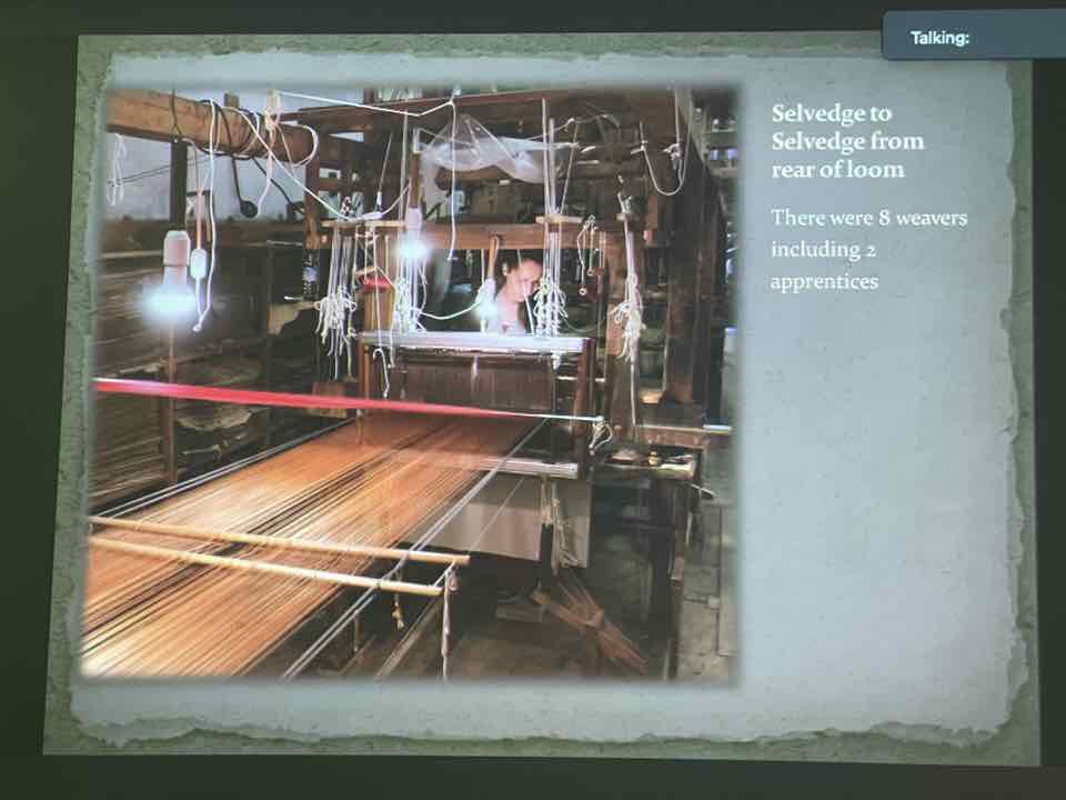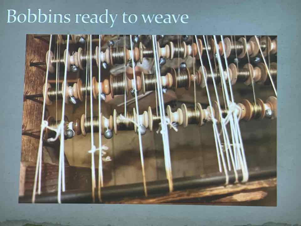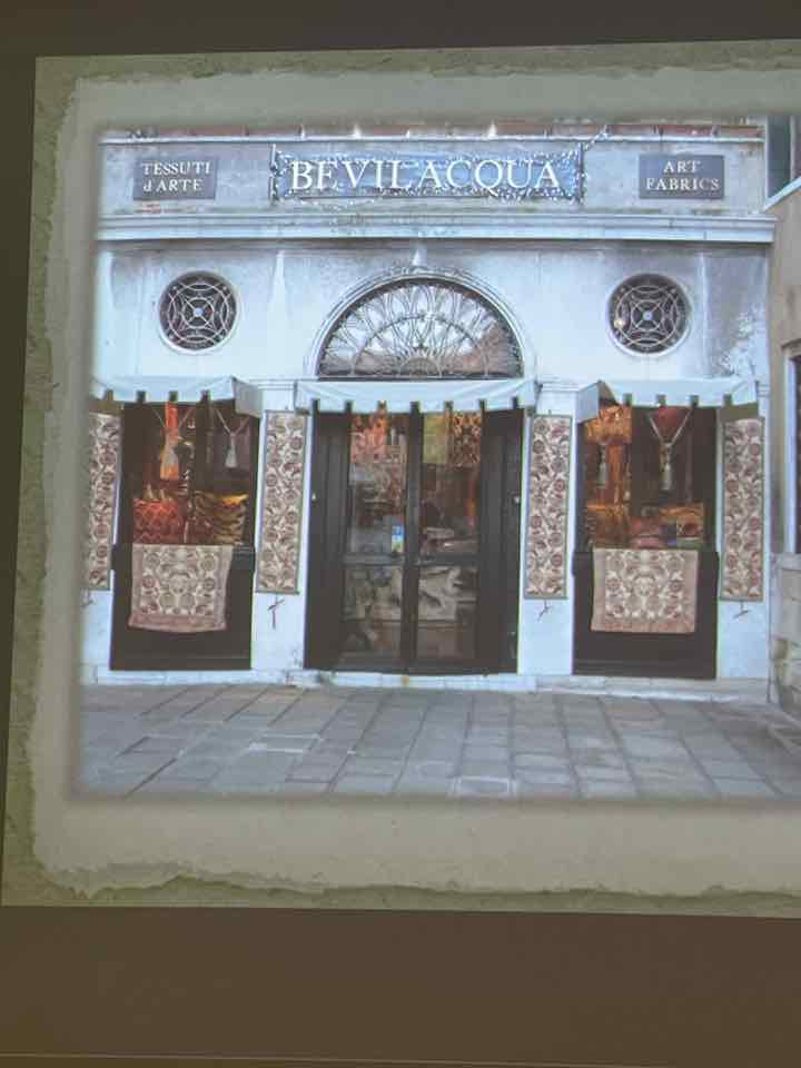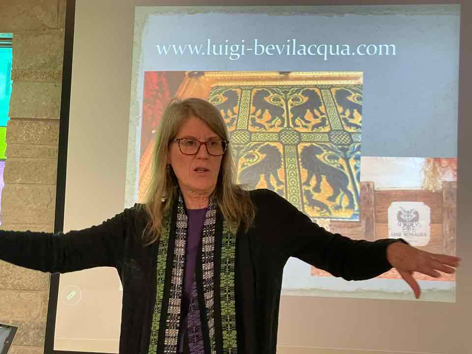 Deb Essen regaled us with stories from her Tour in Venice at the velvet-weaving atelier of Luigi Bevilacqua on the Grand Canal in Venice. The workshop has been in existence since medieval times and much of the equipment dates back centuries. The looms are mechanical dobby looms that use centuries-old and modern cards control the weaving patterns. The photographs in Deb’s slide show were taken by Marty Essen.